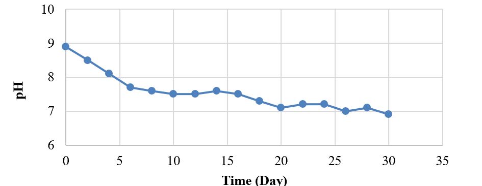 The biogas production profile observed in this study (Figures 5 and 6) followed a classic trend for batch mesophilic digestion. The lag phase, peak production around days 8-9, and subsequent decline correspond to the sequential establishment of hydrolytic, acidogenic, and methanogenic microbial communities, culminating in the depletion of readily degradable substrates 35, 36. The cumulative yield of 5405 mL and 40% volatile solids reduction (VSR) are within the typical range reported for sludge digestion under similar conditions 37, 38. The stability of the process was confirmed by the pH profile (Figure 8), which remained within the optimal range for methanogens (7.6-8.2), and the TVFA dynamics (Figure 9). The transient peak and subsequent decline in TVFAs, alongside stable alkalinity, indicate a well-balanced system in which acid production is efficiently coupled to methane generation, preventing inhibitory acidification 39, 40. The continuous decrease in sCOD (Figure 7) further corroborates the effective removal and conversion of organic carbon.