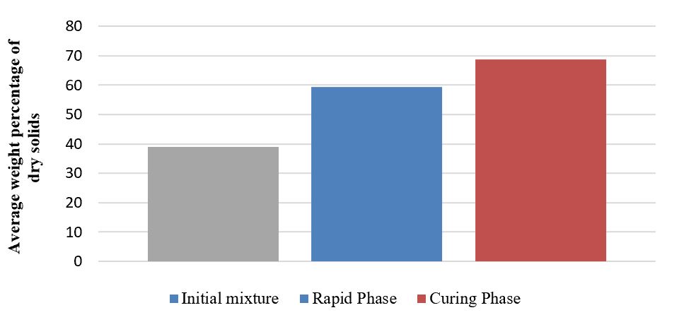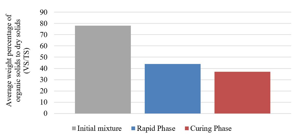 As presented in Table 4, the compost showed clear signs of its stabilization and maturation. The bulk density decreased from 570 ± 15 kg/m³ after the rapid phase to 480.33 ± 12 kg/m³ after curing. The dry solid content increased from 60.1 ± 1.5% to 69.3 ± 1.8%, whereas the volatile solid (VS) content decreased from 44.2 ± 1.2% to 37.1 ± 1.0% of TS, indicating significant organic matter mineralization (Figures 12 & 13).