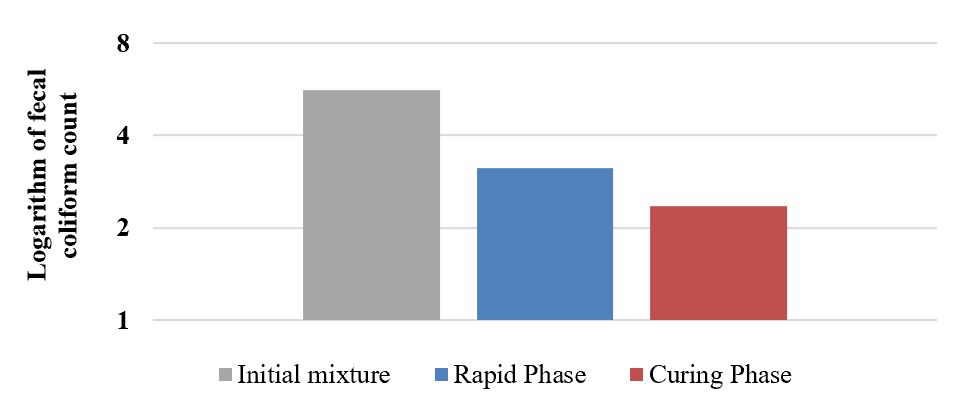 Fecal coliform counts were reduced from log 3.14 ± 0.15 MPN/g to log 2.36 ± 0.12 MPN/g after the rapid phase, and further to below the detection limit ( < 1.0 log MPN/g) after the 30-day curing period (Figure 14), representing a reduction of more than 3-log units. This reduction meets the pathogen inactivation requirement for USEPA Class A biosolids (fecal coliforms < 1000 MPN/g or < 3 log MPN/g) and aligns with the hygienic safety criteria outlined in international compost quality guidelines (e.g., WHO and European standards). While this study confirms hygienic safety and organic matter stabilization, a complete agronomic evaluation, including an analysis of primary nutrients (N-P-K), micropollutants, and potential contaminants such as heavy metals, was beyond its scope. Such comprehensive characterization is recommended for future studies to fully validate the quality and safety of compost for specific agricultural applications.