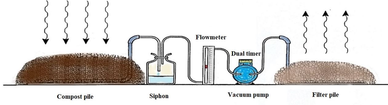 Aeration was achieved by drawing air through the compost matrix using a vacuum pump, ensuring adequate oxygen transfer. Exhaust air containing dust and bioaerosols passed through the leachate siphon and compost biofilter before being released into the environment. The aeration rate was maintained between 0.6 and 1.8 m³ t⁻¹ DM day⁻¹, while the oxygen concentration at the pile surface was measured daily and adjusted according to temperature variations as indicators of microbial activity. A minimum oxygen concentration of 5% was maintained throughout the experiment.