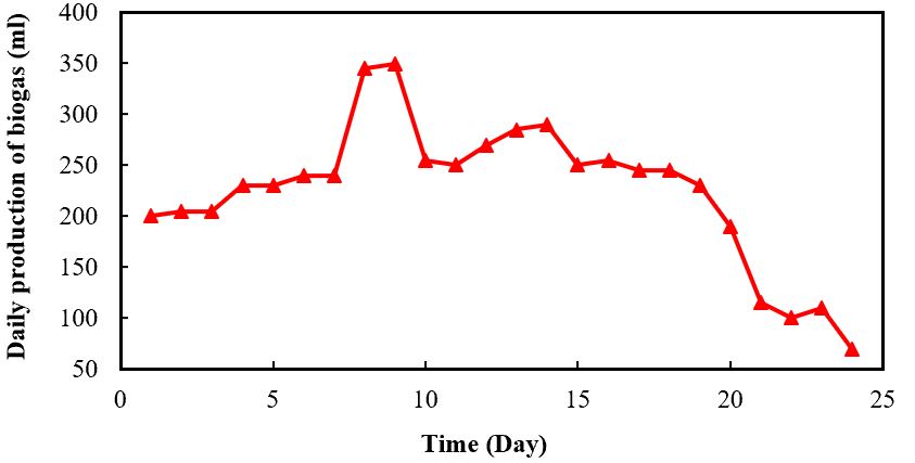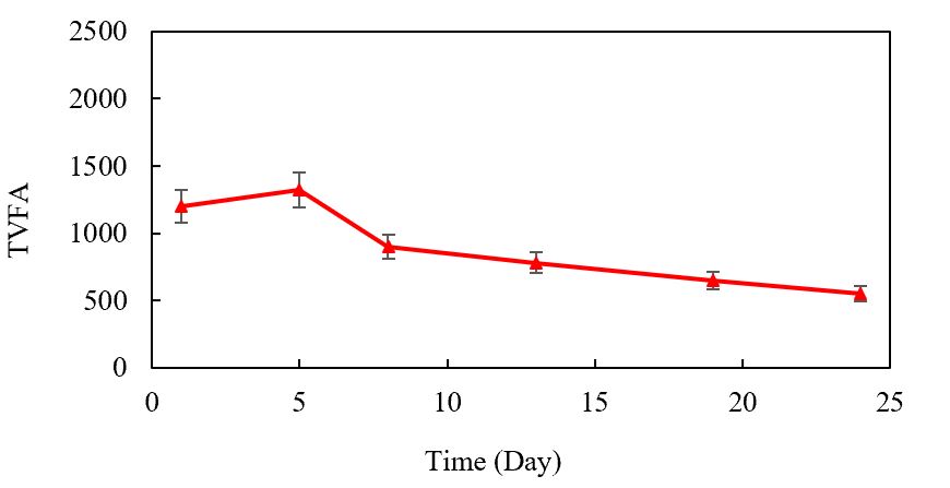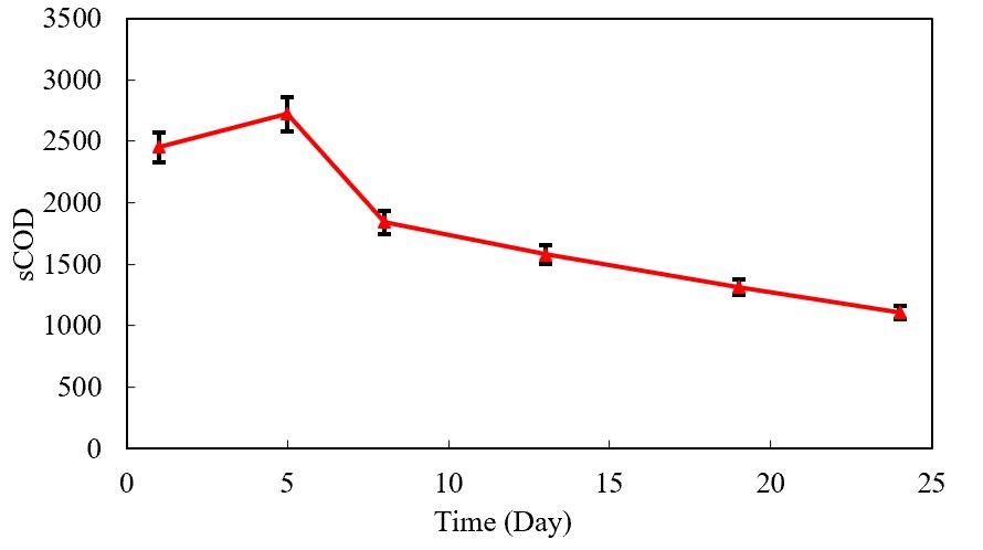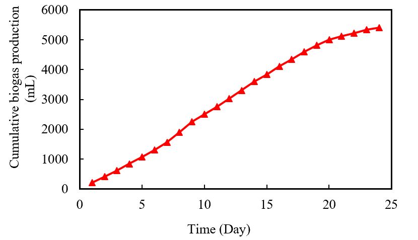 Throughout the 24-day period, the reactor performance was assessed on days 1, 5, 9, 13, 19, and 24 by monitoring sCOD, total suspended solids (TSS), VS, TVFA, and alkalinity 25. Volatile fatty acids and alkalinity key indicators of process stabilitywere determined using the Nordmann titration method 26.