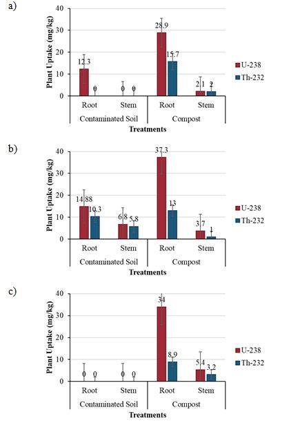 Radionuclides absorbed by plant organs (roots and stems) were determined using Plasma Atomic Emission Spectrometry (PAES). Compost-amended soil contributed to higher radionuclide absorption, particularly uranium, compared to contaminated soil. Compost can improve phytoremediation in contaminated areas by reducing metal(loid) mobility and providing essential nutrients that promote plant growth and stress tolerance 9, 38. Compost is also rich in micronutrients like magnesium, zinc, and iron, which are essential for plant health 39.