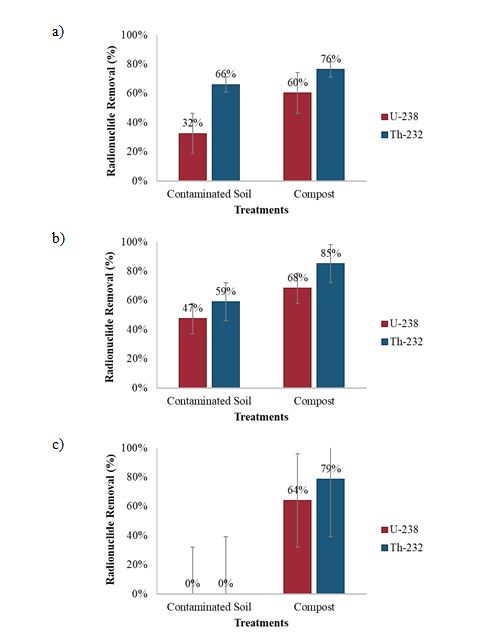 The highest efficiencies were observed in all compost-amended pots. Th-232 removal was higher than U-238 removal across all treatments. Additionally, H. aphyllum-planted soil removed the most U-238 (68%) and Th-232 (85%) compared to soils planted with N. schoberi and A. canescens.